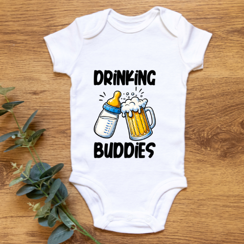 This adorable and cheeky baby vest is perfect for giggles and Instagram-worthy moments. Featuring the quote “Drinking Buddies” alongside a fun design of a milk bottle and a beer bottle, it's the perfect gift for new dads and their tiny sidekicks.