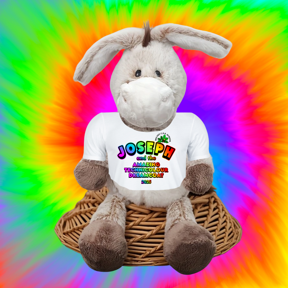 Joseph and the Amazing Technicolour Dreamcoat Donkey Plush Teddy – With Personalised T-Shirt Featuring School Logo