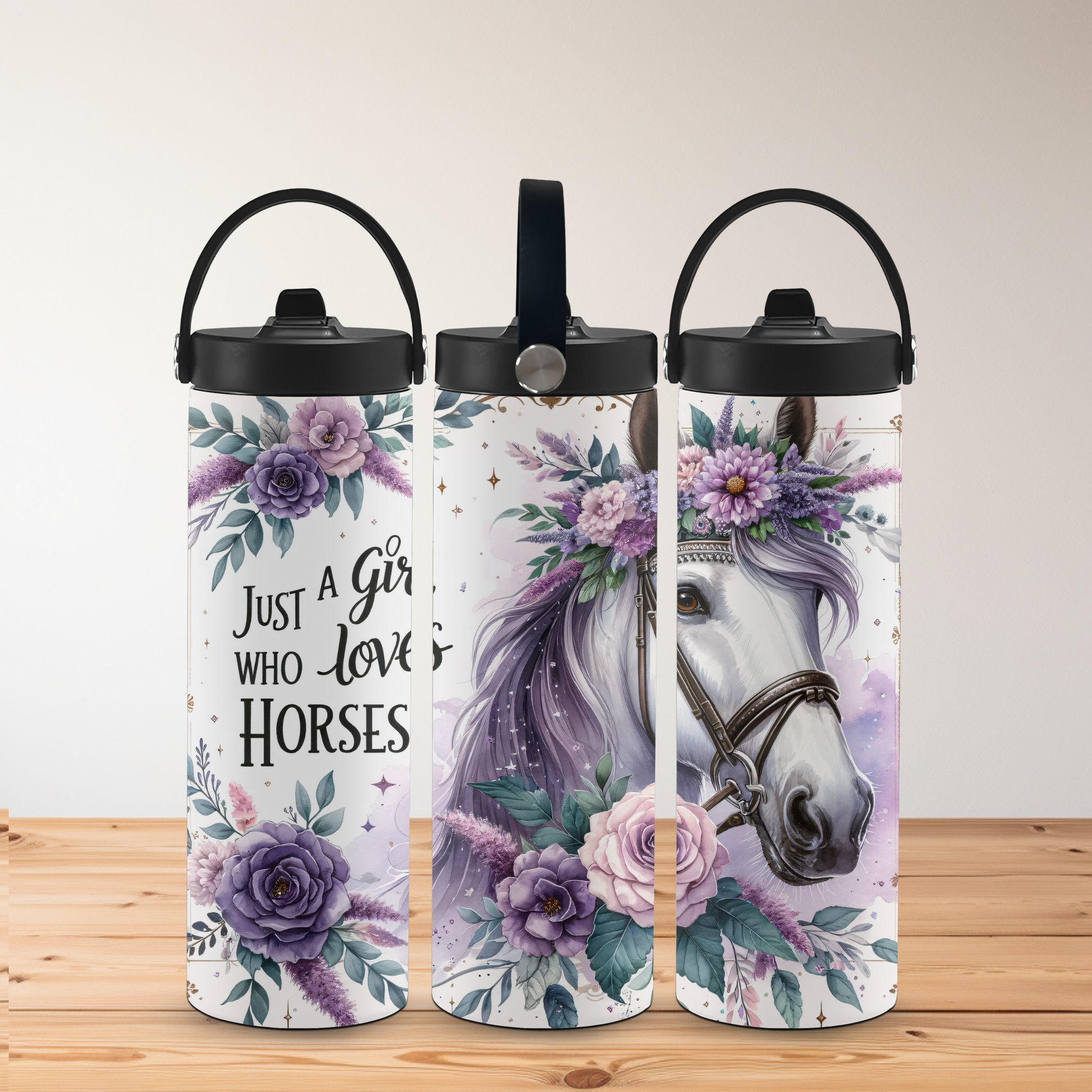 Saddle up in style with our beautifully designed 20oz tumbler featuring a pink and purple floral horse illustration and the quote: "Just a Girl Who Loves Horses". Whether you're heading to the stables, school, work, or on a countryside ride, this tumbler is the perfect companion for horse lovers everywhere.