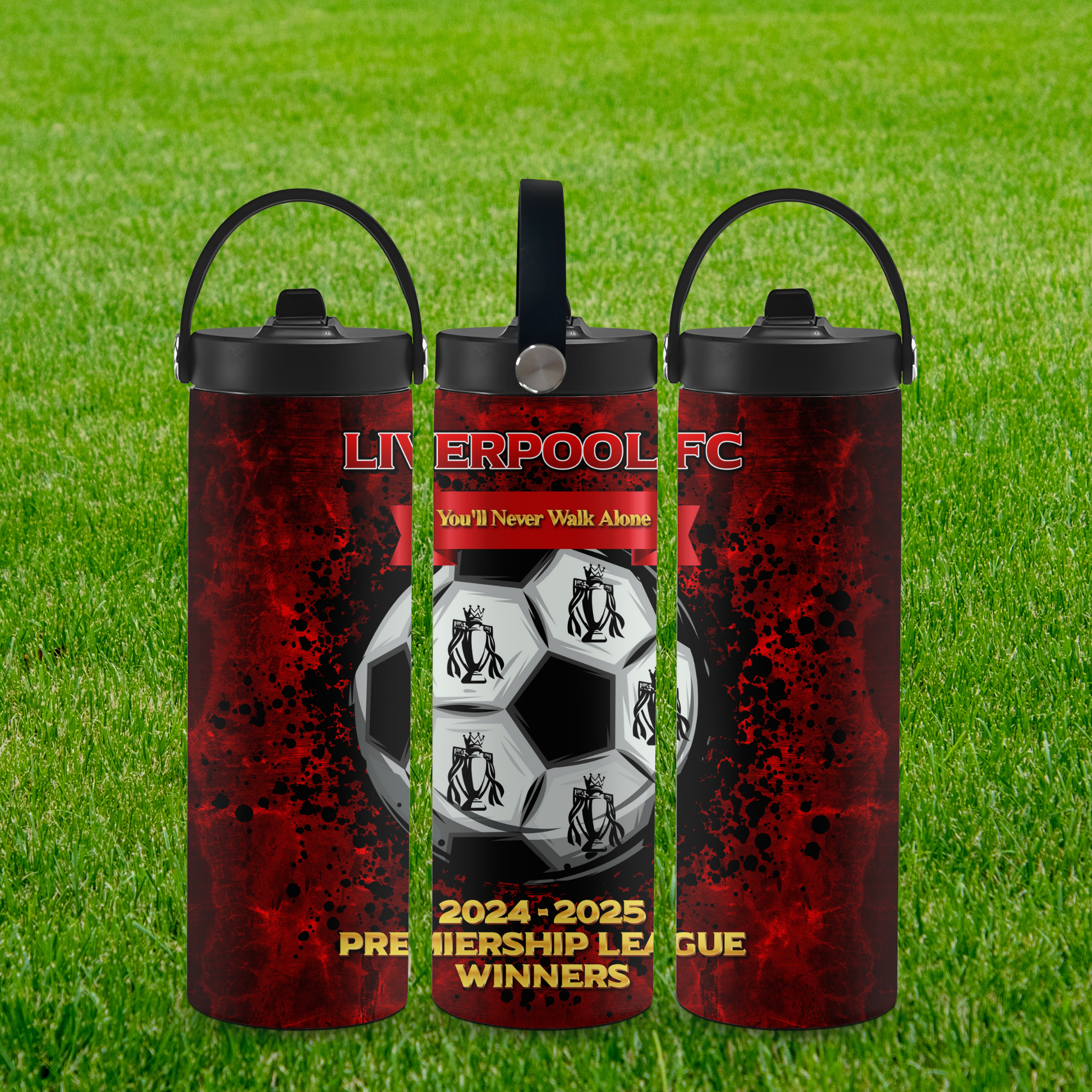 Crafted with stainless steel and wrapped in a striking red and black design, this tumbler proudly showcases Liverpool’s latest triumph. The bold artwork features the iconic "You'll Never Walk Alone" banner, a powerful football graphic, and golden text marking the club’s Premiership glory.