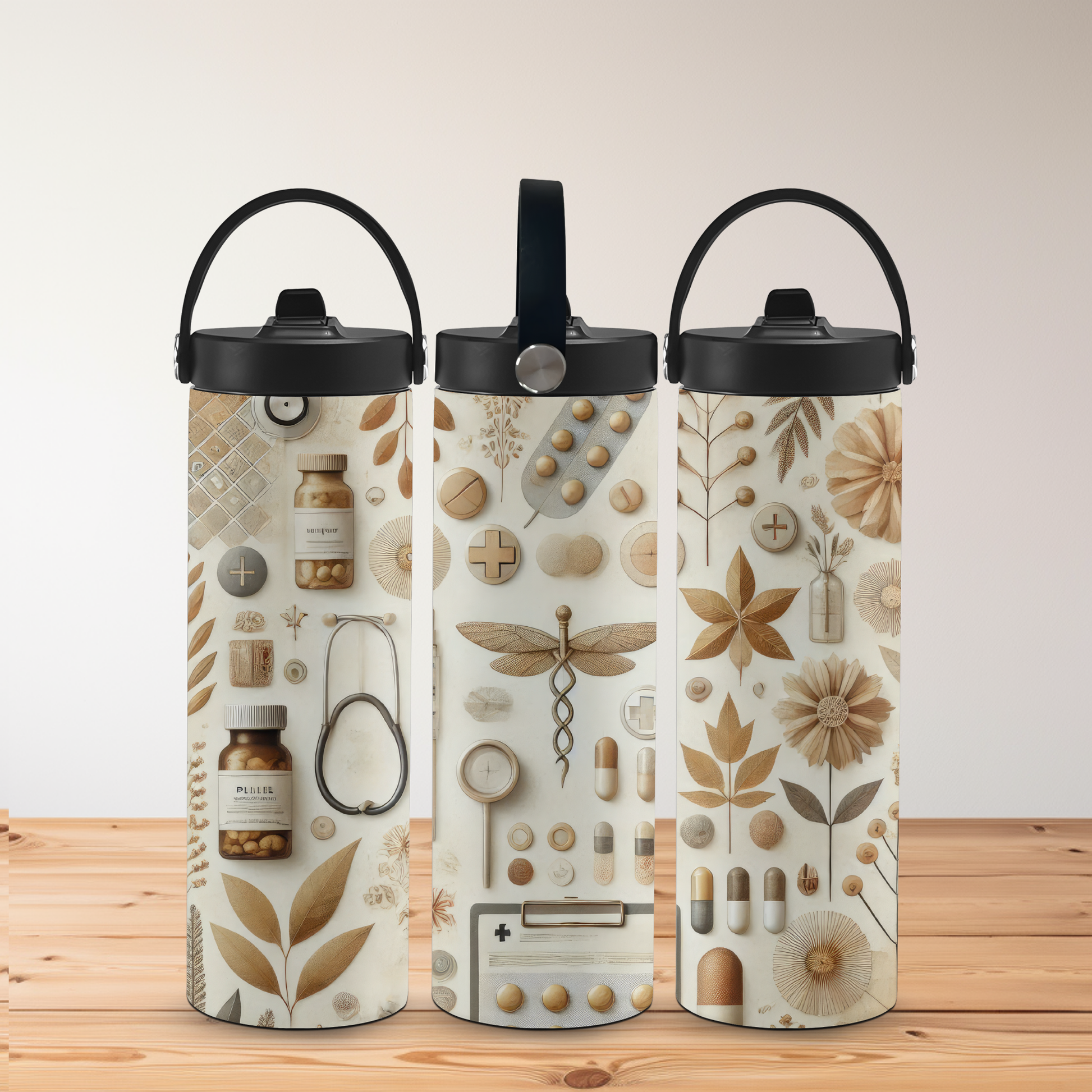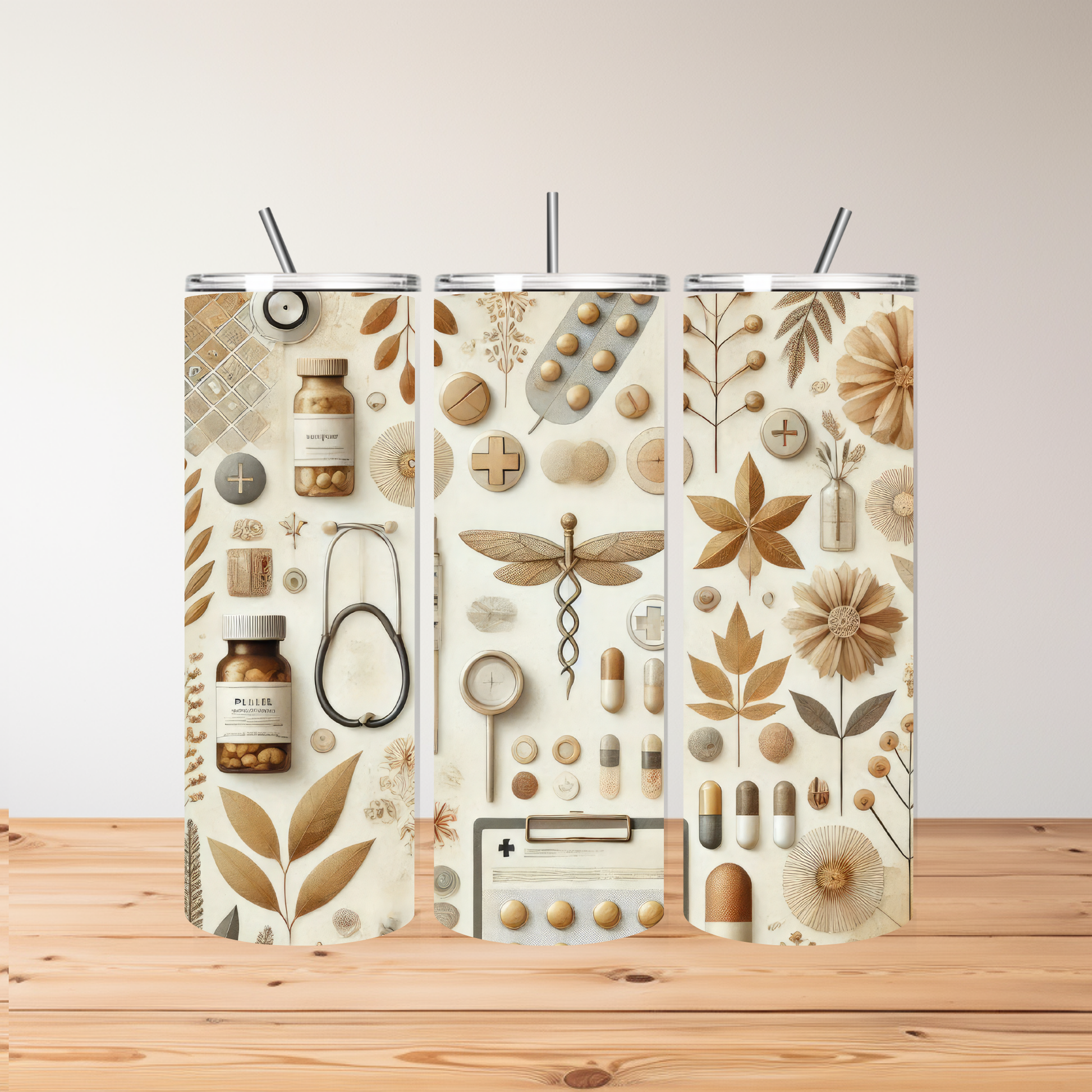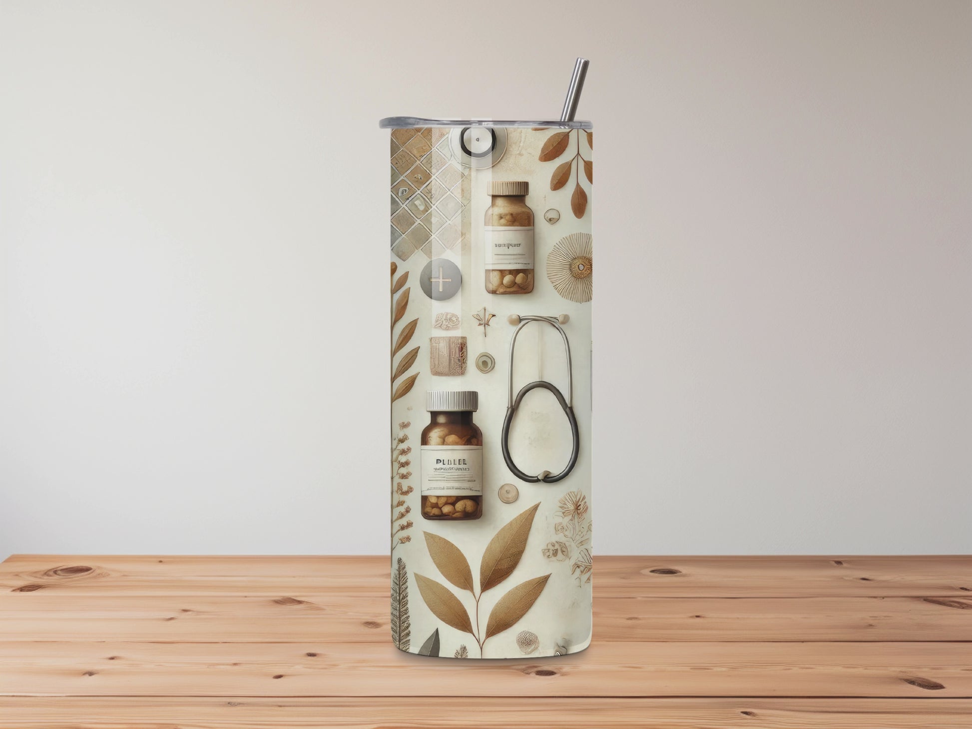 Designed with a sleek, earthy brown background and subtle pharmacy-inspired illustrations (prescription bottles, capsules), this 20oz double-walled stainless steel tumbler keeps your drink hot for up to 6 hours or cold for up to 12 hours.