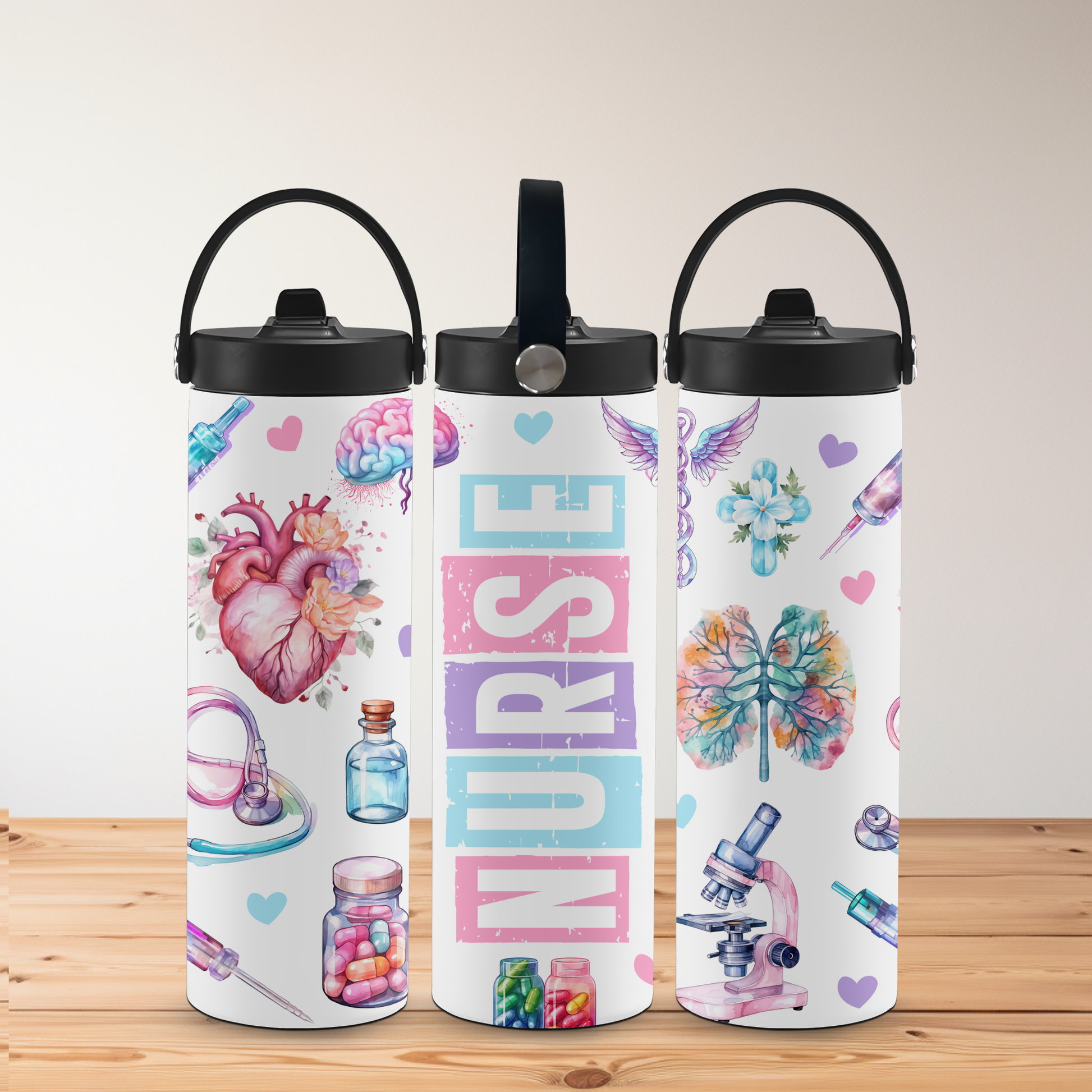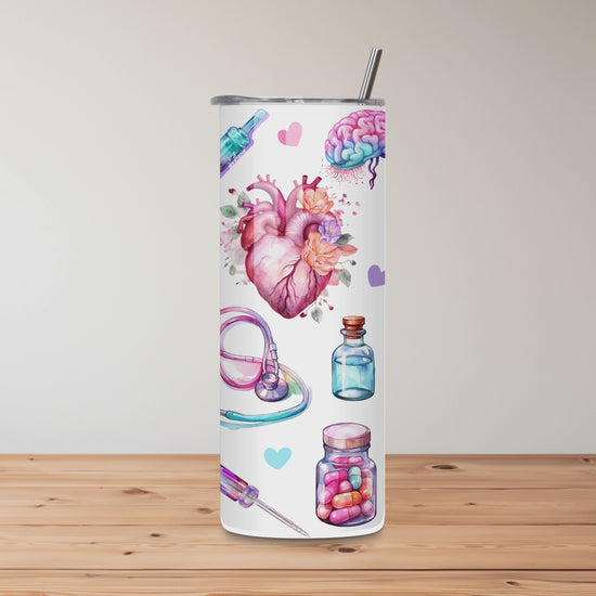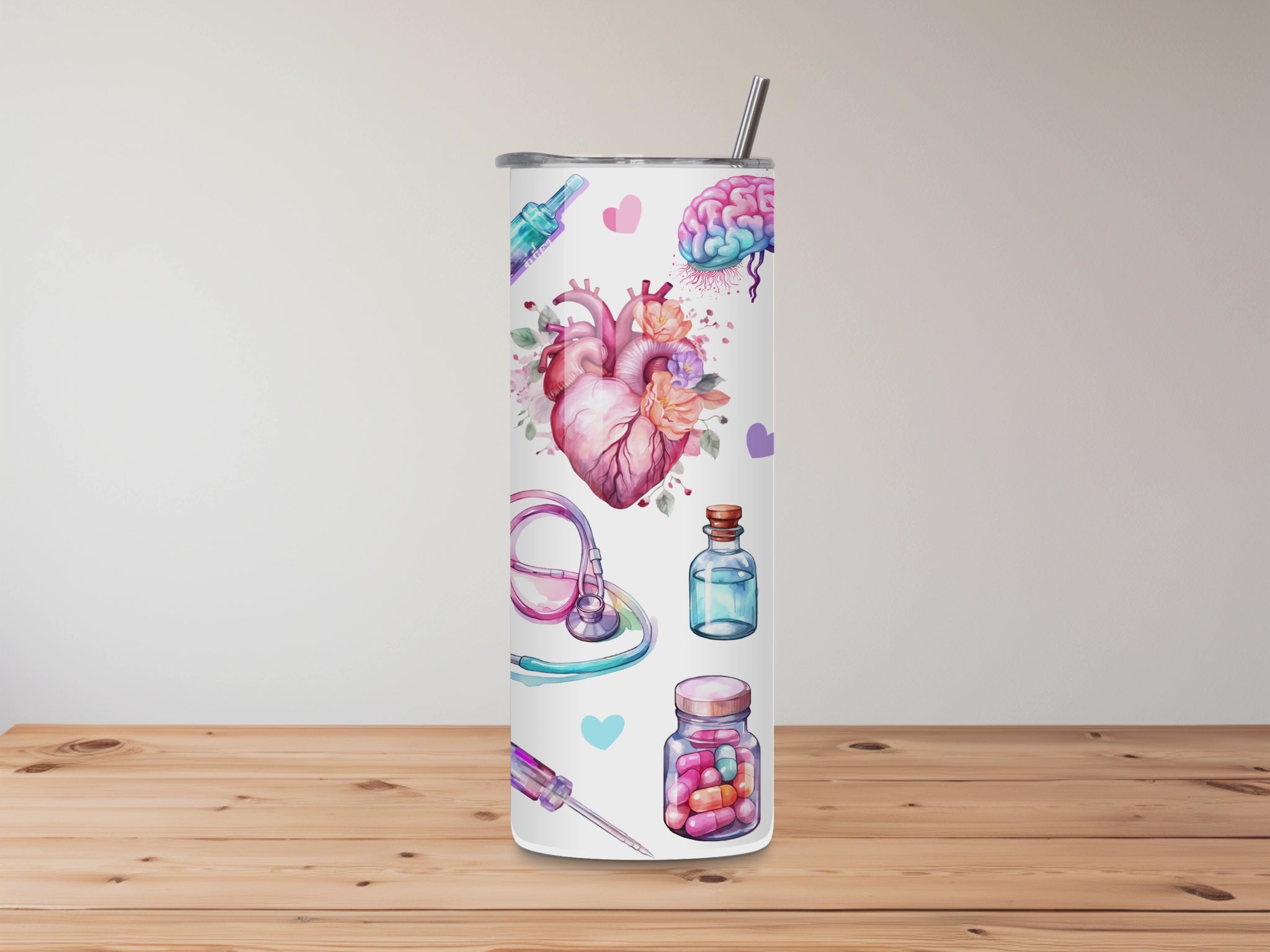 This beautifully designed 20oz stainless steel tumbler features soft pastel medical illustrations – stethoscopes, syringes, heartbeats, and more – a perfect tribute to the everyday heroes in scrubs.