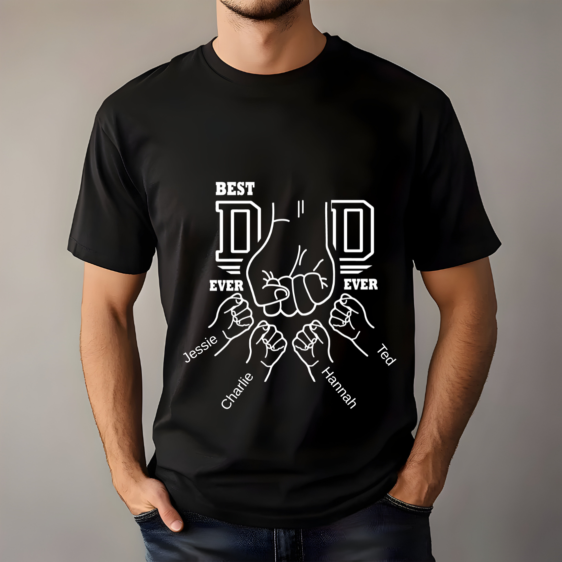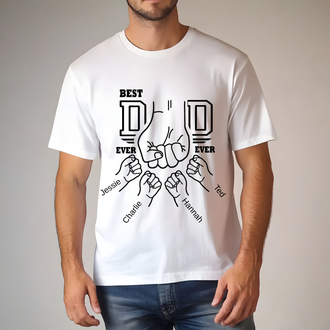 Celebrate fatherhood with this heart-warming and fun "Dad & Kids Fist Bump" design – personalised with each child’s name and matching fist bump artwork. A memorable gift he’ll proudly wear and cherish!