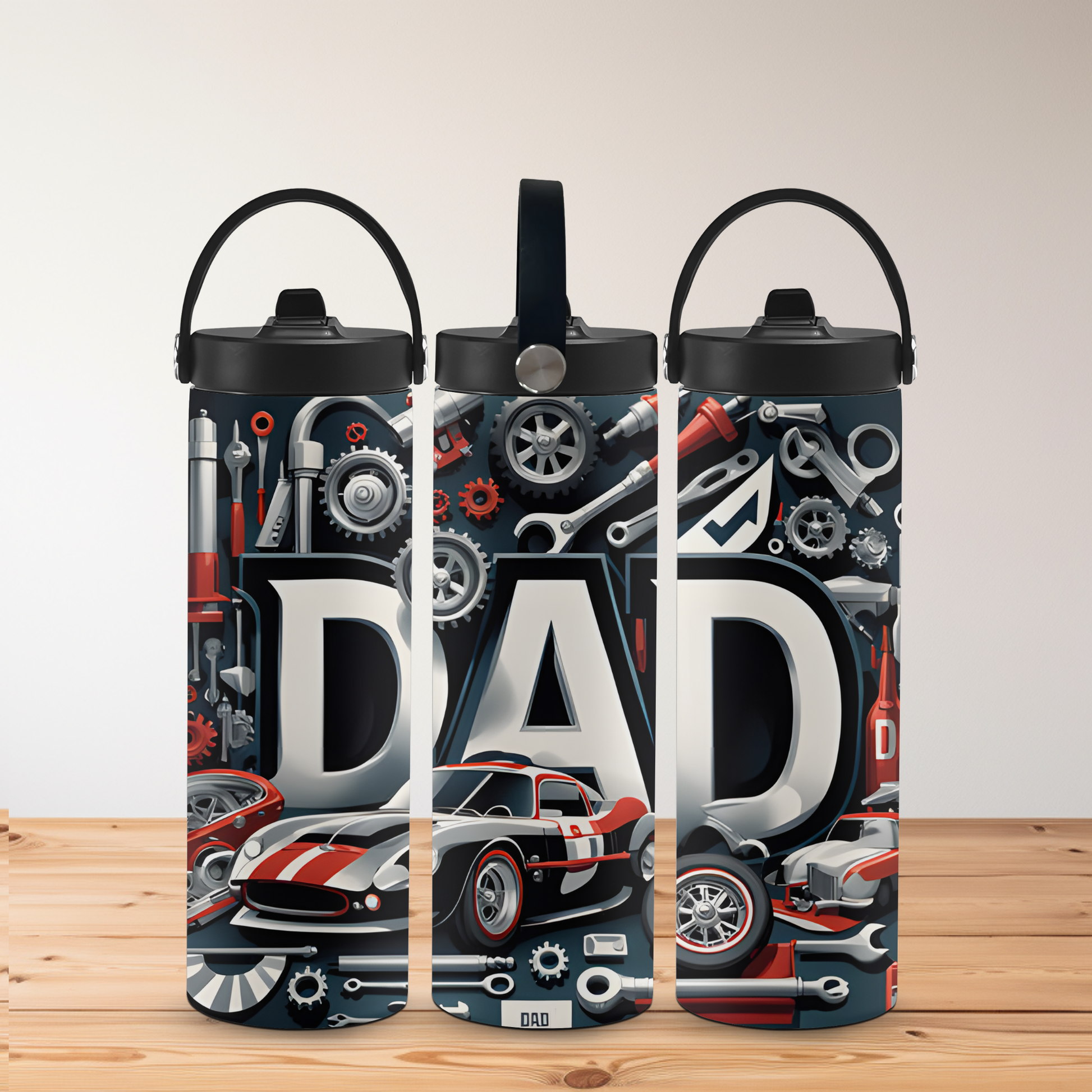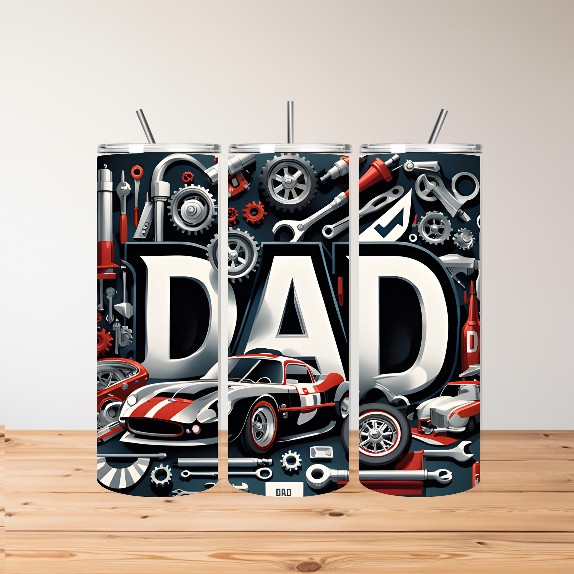 This bold 20oz insulated tumbler is made for the dads who love their cars, tools, and tinkering. Featuring a detailed automotive design with a car, tools, and bolts, it’s the ideal gift for Father’s Day, birthdays, or just because.