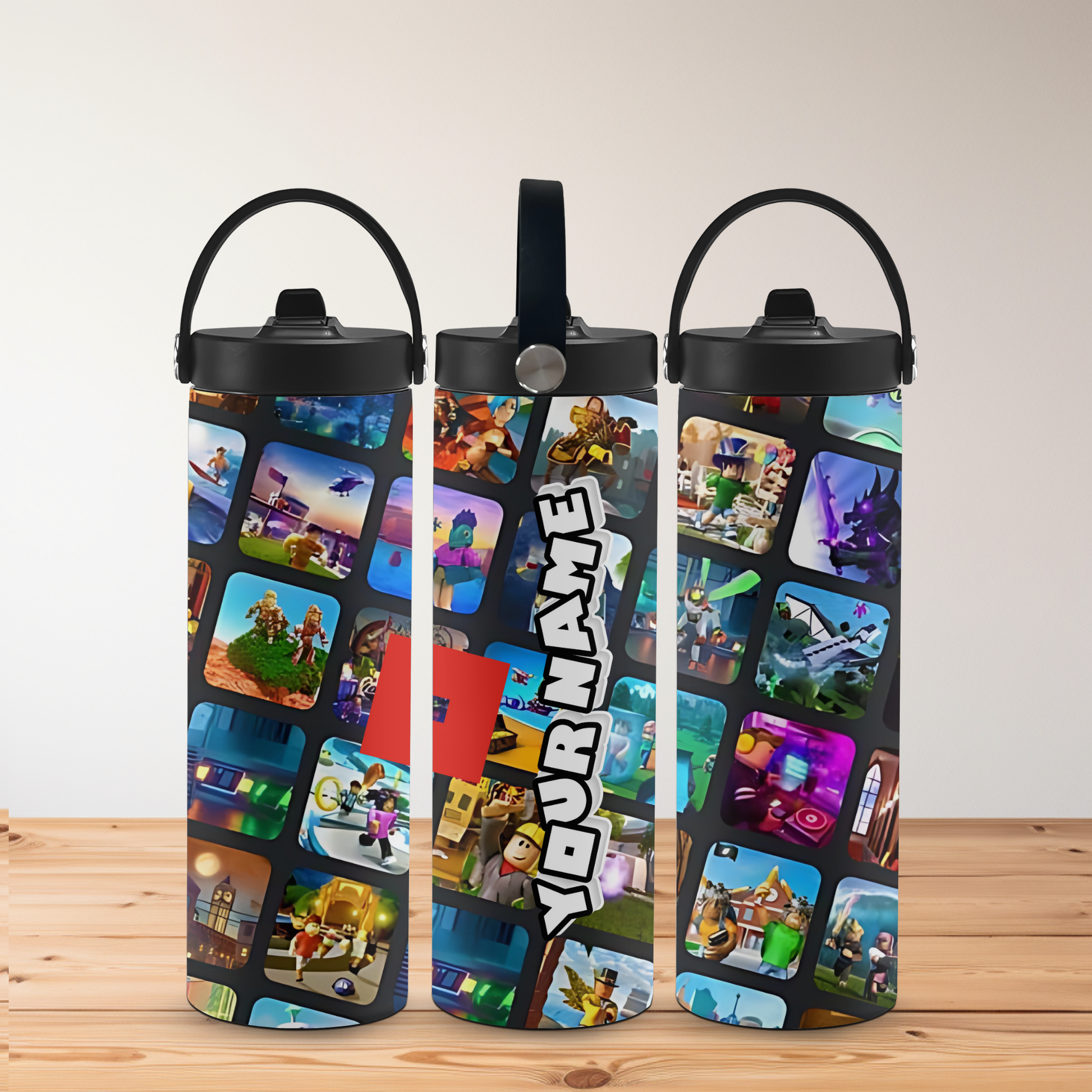 Keep hydrated in style with our Roblox-Inspired Gamer Water Bottle, ideal for every gaming fan! Featuring a bold, vibrant design packed with exciting Roblox scenes, this bottle is perfect whether you're powering through a game or heading off to school.