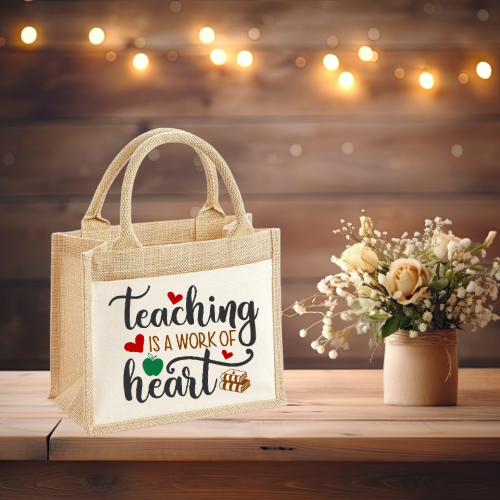 Show your appreciation in style with our Teacher Appreciation Jute Tote Bag, beautifully designed with the heartfelt quote “Teaching is a Work of Heart”. Perfect for end-of-year gifts, teacher birthdays, or just because they deserve it!